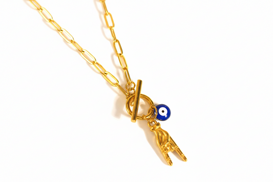 Gold Paperclip Chain Necklace with Evil Eye & Rock On Hand Charms